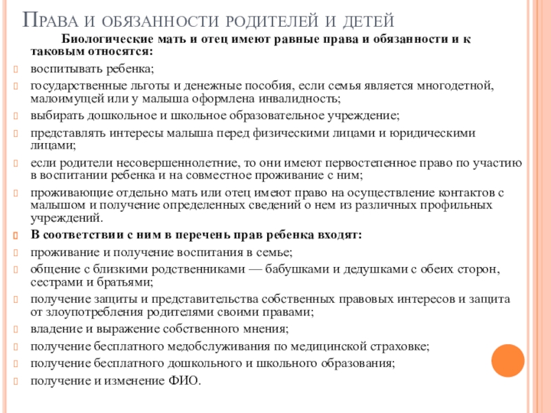 Биологические мать и отец имеют равные права и обязанности и к таковым относятся: