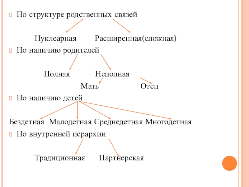 По структуре родственных связей      Нуклеарная    Расширенная(сложная) По наличию родителей