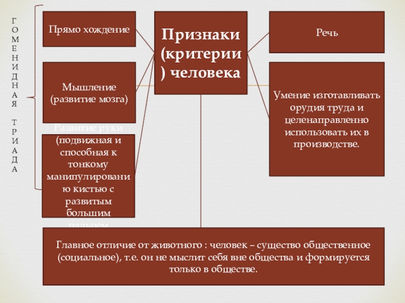 Главное отличие от животного : человек – существо общественное (социальное), т.е. он не мыслит себя вне общества и формируется только в обществе.