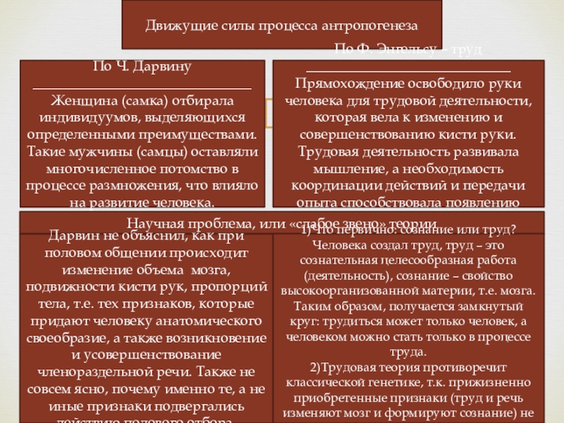 2)Трудовая теория противоречит классической генетике, т.к. прижизненно приобретенные признаки (труд и речь изменяют мозг и формируют сознание) не передаются по наследству.