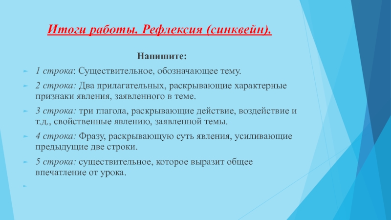 Слайд 13Итоги работы. Рефлексия (синквейн).