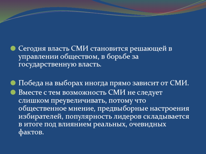 Вместе с тем возможность СМИ не следует слишком преувеличивать, потому что общественное мнение, предвыборные настроения избирателей, популярность лидеров складывается в итоге под влиянием реальных, очевидных фактов.