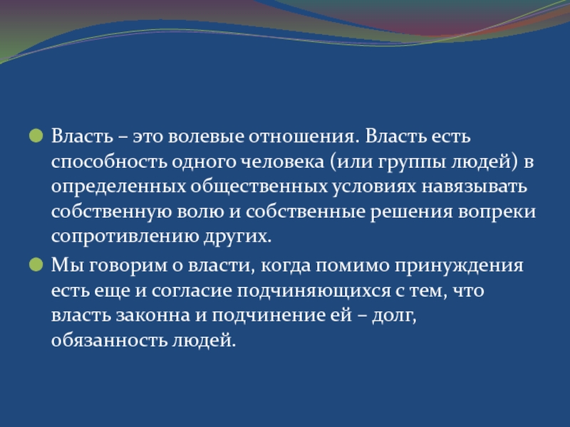 Слайд 4Власть – это волевые отношения. Власть есть способность одного человека (или