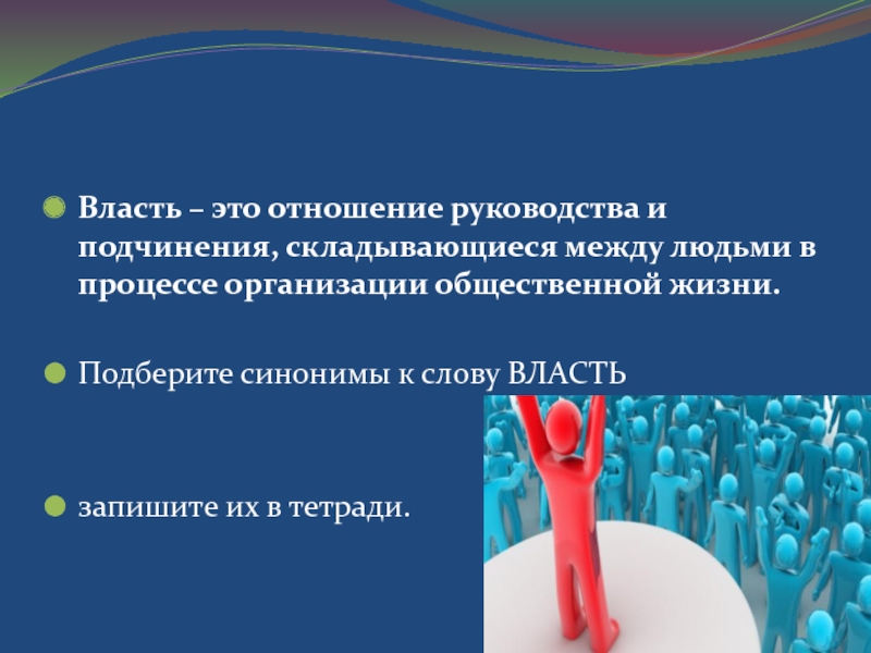 Слайд 5Власть – это отношение руководства и подчинения, складывающиеся между людьми в