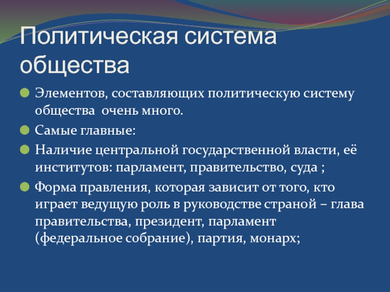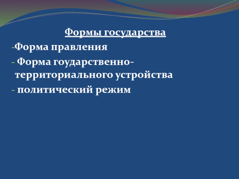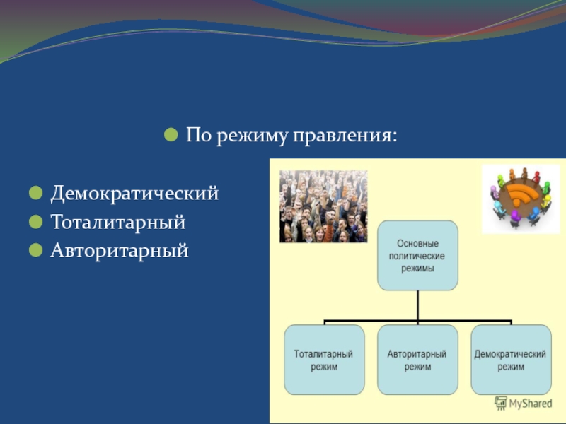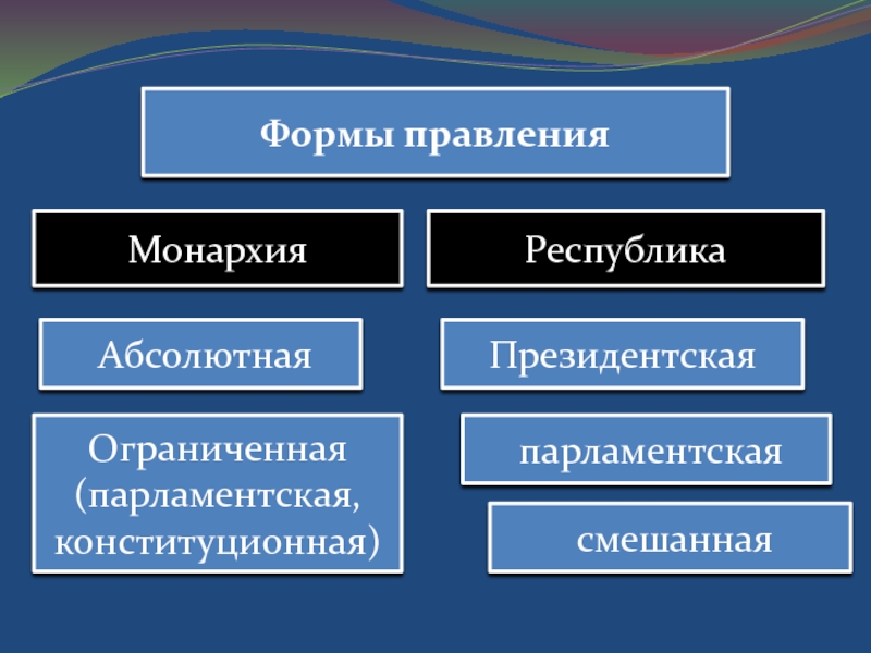 Форма правления, которая зависит от того, кто играет ведущую роль в руководстве страной – глава правительства, президент, парламент (федеральное собрание), партия, монарх;