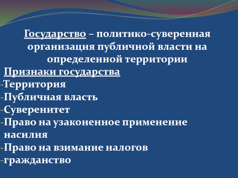 Слайд 37Государство – политико-суверенная организация публичной власти на определенной территории