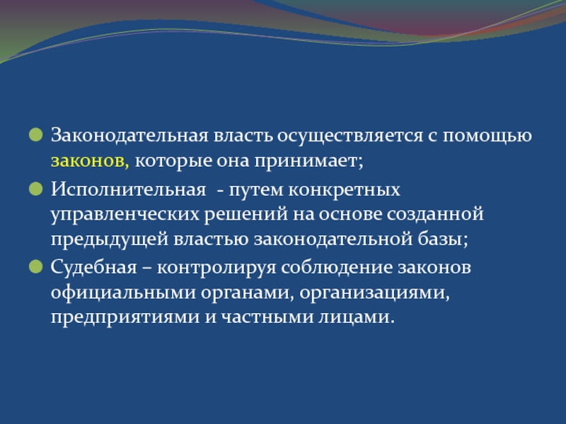 Слайд 17Законодательная власть осуществляется с помощью законов, которые она принимает;