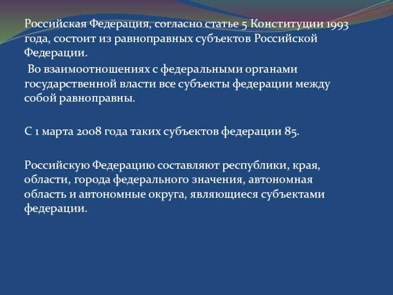 Слайд 44Российская Федерация, согласно статье 5 Конституции 1993 года, состоит из равноправных