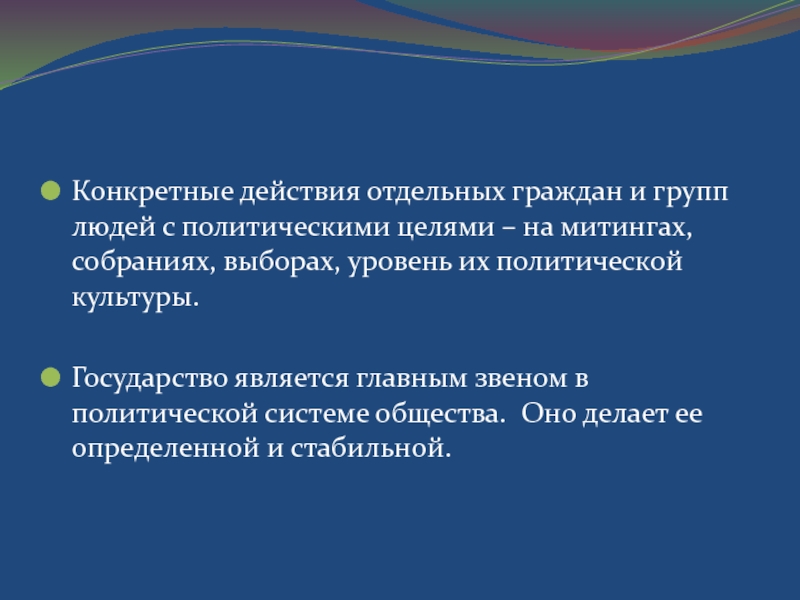 Слайд 24Конкретные действия отдельных граждан и групп людей с политическими целями –