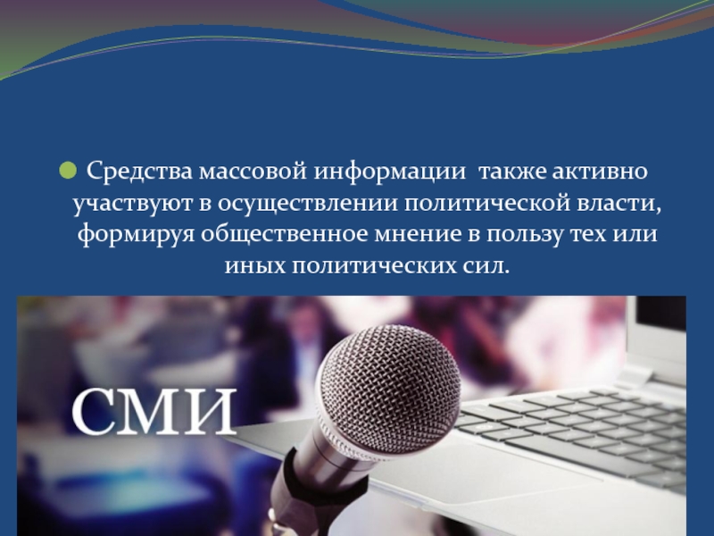 Слайд 18Средства массовой информации также активно участвуют в осуществлении политической власти, формируя