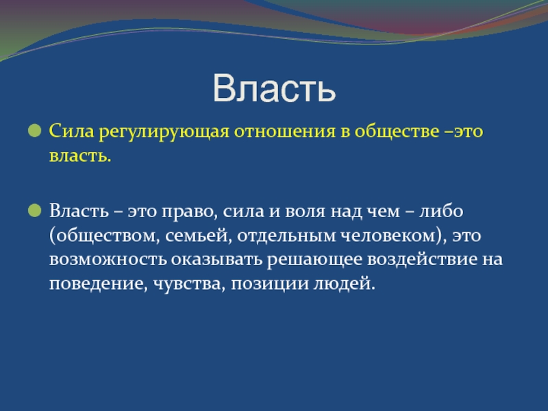 право, сила и воля над чем – либо (обществом, семьей, отдельным человеком), это возможность оказывать решающее воздействие на поведение, чувства, позиции людей.