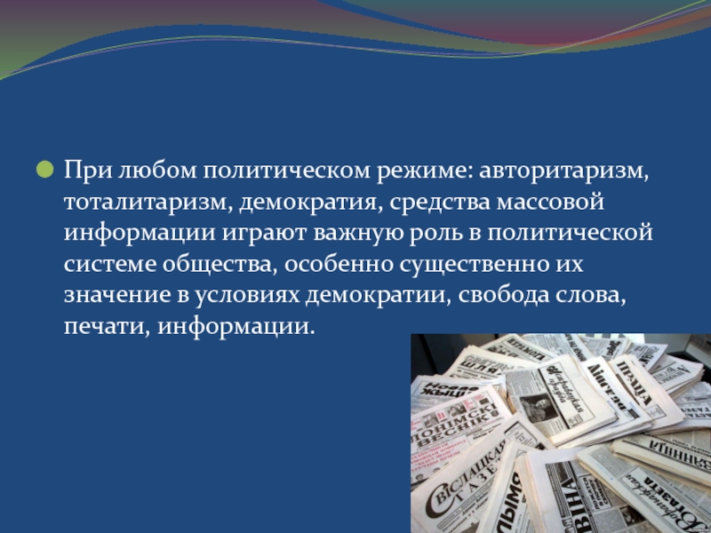 Слайд 25При любом политическом режиме: авторитаризм, тоталитаризм, демократия, средства массовой информации играют