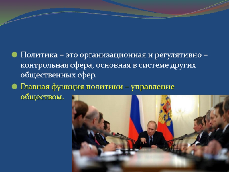 Слайд 15Политика – это организационная и регулятивно – контрольная сфера, основная в