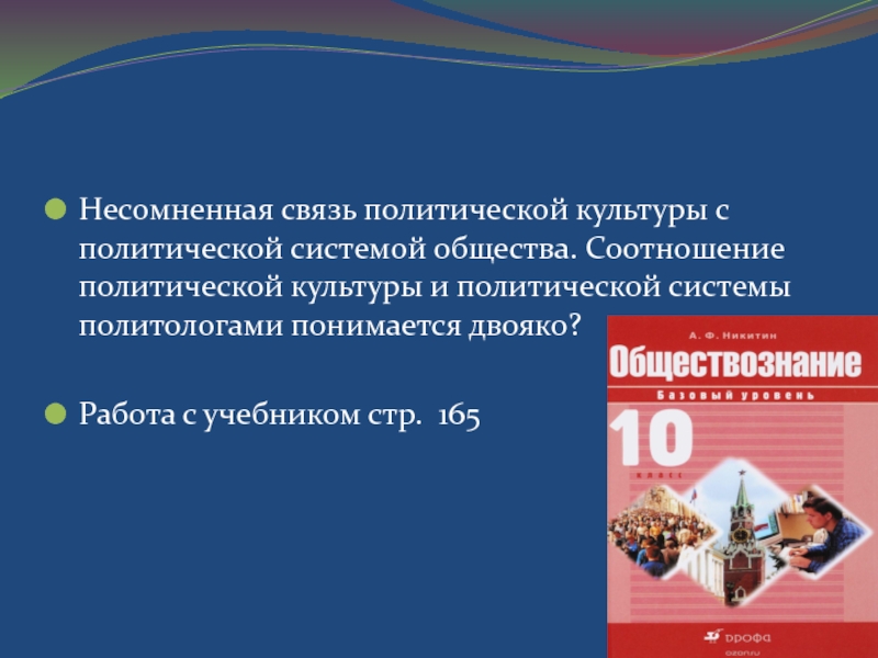Слайд 31Несомненная связь политической культуры с политической системой общества. Соотношение политической культуры