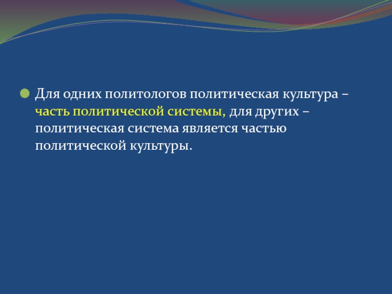 Слайд 32Для одних политологов политическая культура – часть политической системы, для других