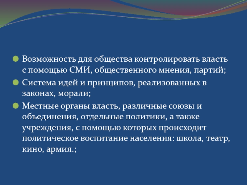 Слайд 23Возможность для общества контролировать власть с помощью СМИ, общественного мнения, партий;