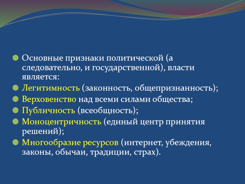 Слайд 21Основные признаки политической (а следовательно, и государственной), власти является: