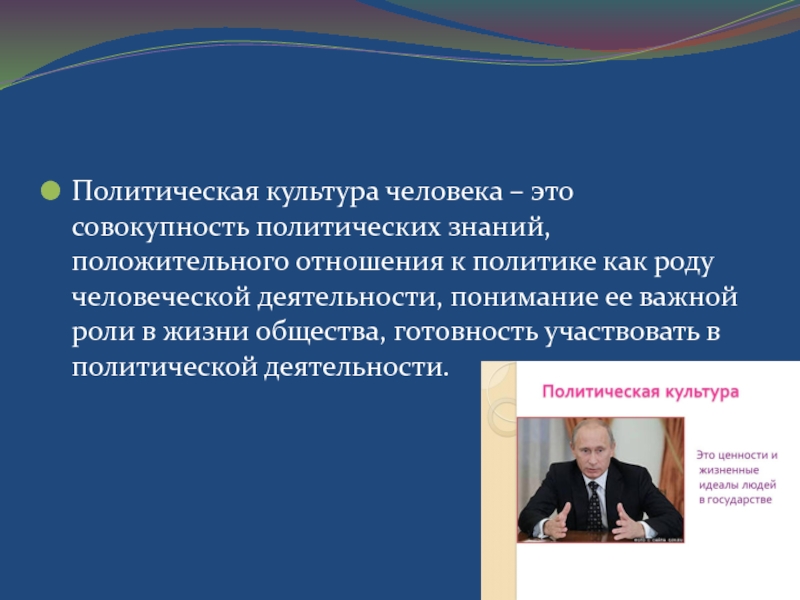 Слайд 33Политическая культура человека – это совокупность политических знаний, положительного отношения к