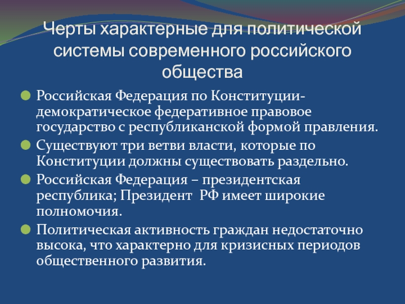 Российская Федерация – президентская республика; Президент РФ имеет широкие полномочия.