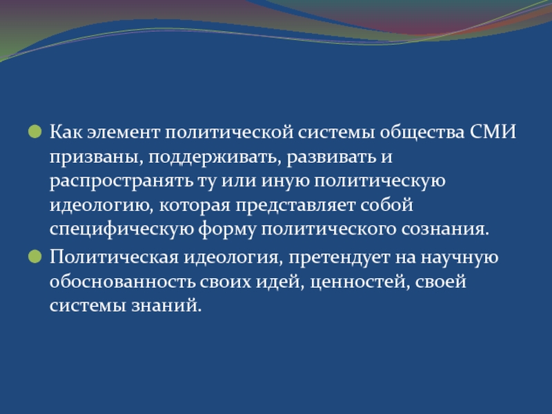 Слайд 28Как элемент политической системы общества СМИ призваны, поддерживать, развивать и распространять