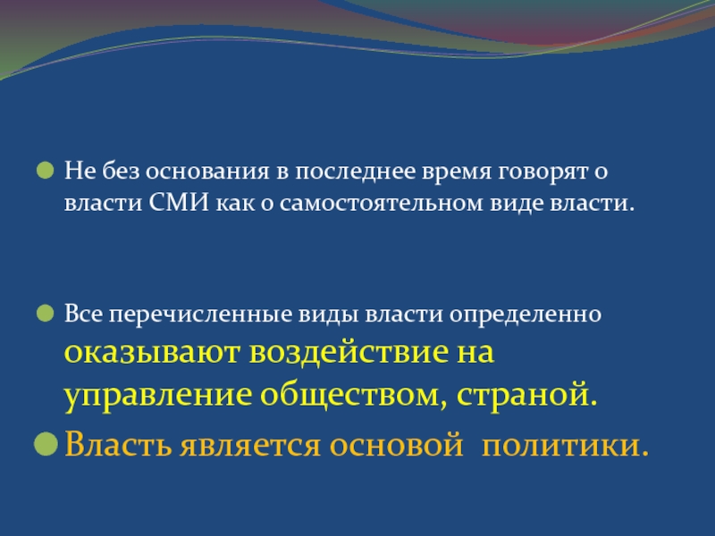 Слайд 13Не без основания в последнее время говорят о власти СМИ как