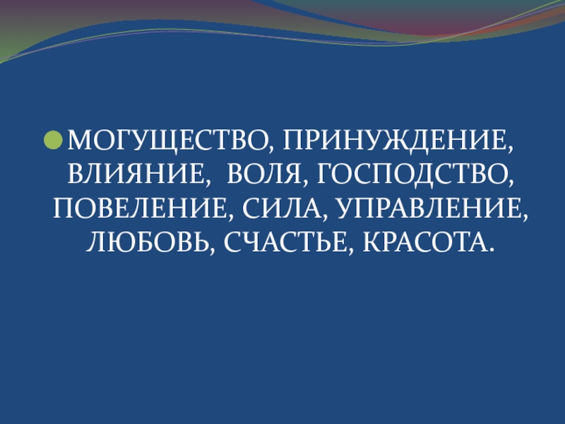Слайд 6МОГУЩЕСТВО, ПРИНУЖДЕНИЕ, ВЛИЯНИЕ, ВОЛЯ, ГОСПОДСТВО, ПОВЕЛЕНИЕ, СИЛА, УПРАВЛЕНИЕ, ЛЮБОВЬ, СЧАСТЬЕ, КРАСОТА.