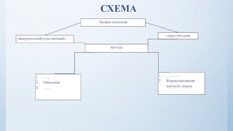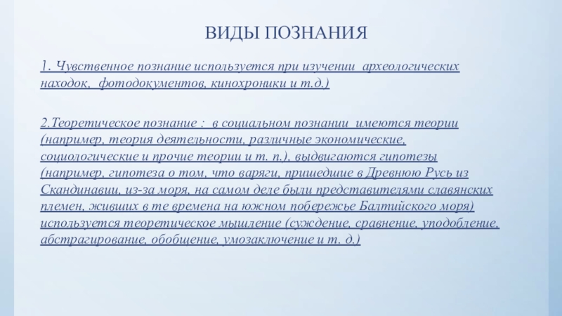2.Теоретическое познание : в социальном познании имеются теории (например, теория деятельности, различные экономические, социологические и прочие теории и т. п.), выдвигаются гипотезы (например, гипотеза о том, что варяги, пришедшие в Древнюю Русь из Скандинавии, из-за моря, на самом деле были представителями славянских племен, живших в те времена на южном побережье Балтийского моря) используется теоретическое мышление (суждение, сравнение, уподобление, абстрагирование, обобщение, умозаключение и т. д.)