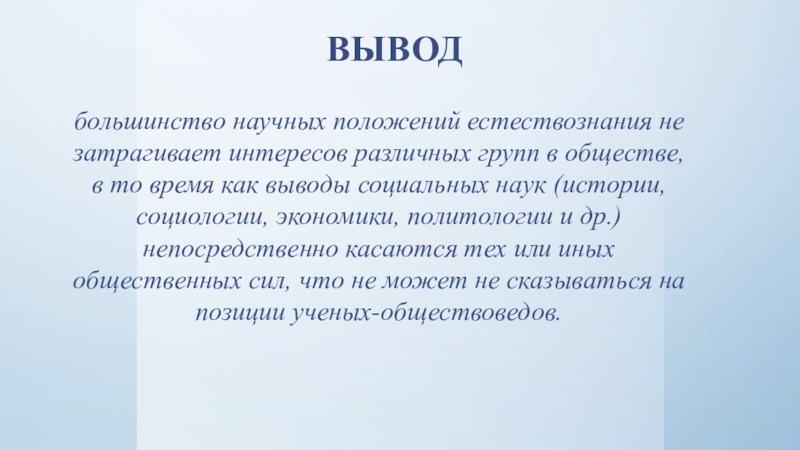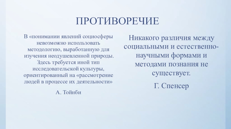 В «понимании явлений социосферы невозможно использовать методологию, выработанную для изучения неодушевленной природы. Здесь требуется иной тип исследовательской культуры, ориентированный на «рассмотрение людей в процессе их деятельности»