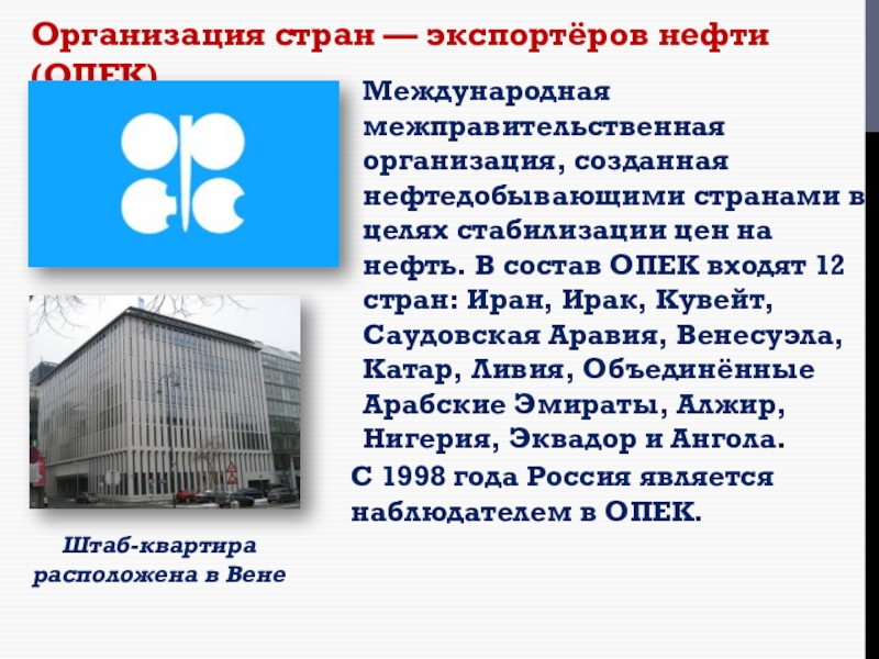 С 1998 года Россия является наблюдателем в ОПЕК.
