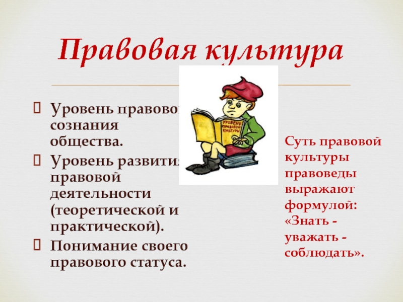 Суть правовой культуры правоведы выражают формулой: «Знать - уважать - соблюдать».