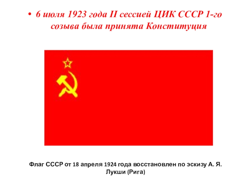 Флаг СССР от 18 апреля 1924 года восстановлен по эскизу А. Я. Лукши (Рига)