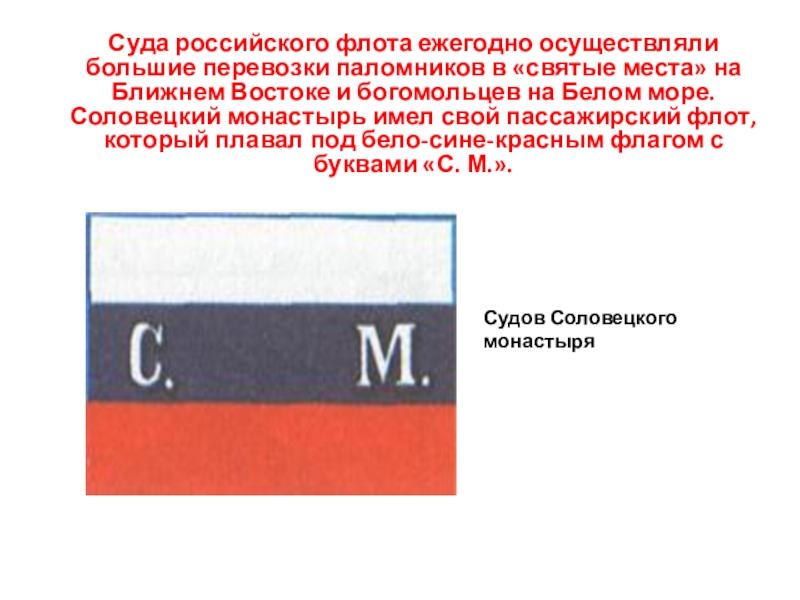 на Ближнем Востоке и богомольцев на Белом море. Соловецкий монастырь имел свой пассажирский флот, который плавал под бело-сине-красным флагом с буквами «С. М.».