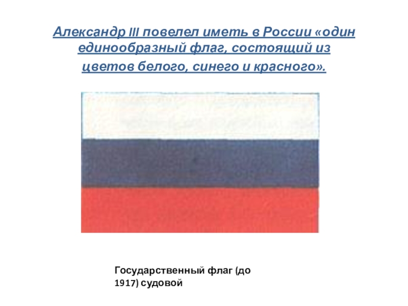 Слайд 24Александр III повелел иметь в России «один единообразный флаг, состоящий из