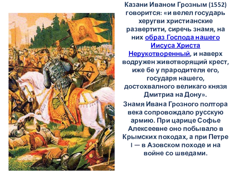 велел государь херугви христианские развертити, сиречь знамя, на них образ Господа нашего Иисуса Христа Нерукотворенный, и наверх водружен животворящий крест, иже бе у прародителя его, государя нашего, достохвалного великаго князя Дмитриа на Дону».