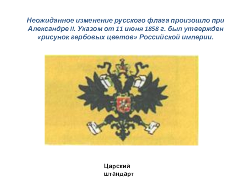Слайд 21Неожиданное изменение русского флага произошло при Александре II. Указом от 11