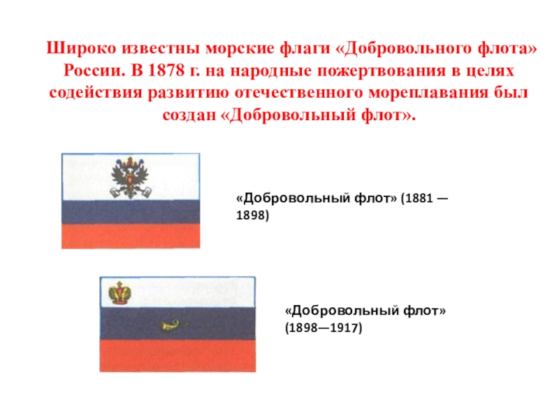 Слайд 26Широко известны морские флаги «Добровольного флота» России. В 1878 г. на