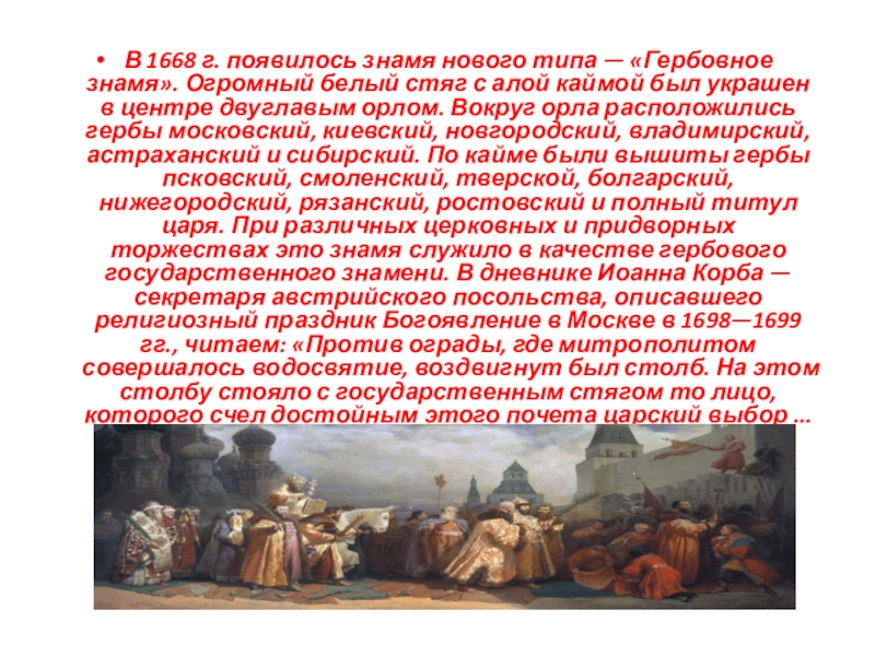 Слайд 13В 1668 г. появилось знамя нового типа — «Гербовное знамя». Огромный