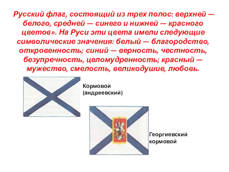 синего и нижней — красного цветов». На Руси эти цвета имели следующие символические значения: белый — благородство, откровенность; синий — верность, честность, безупречность, целомудренность; красный — мужество, смелость, великодушие, любовь.