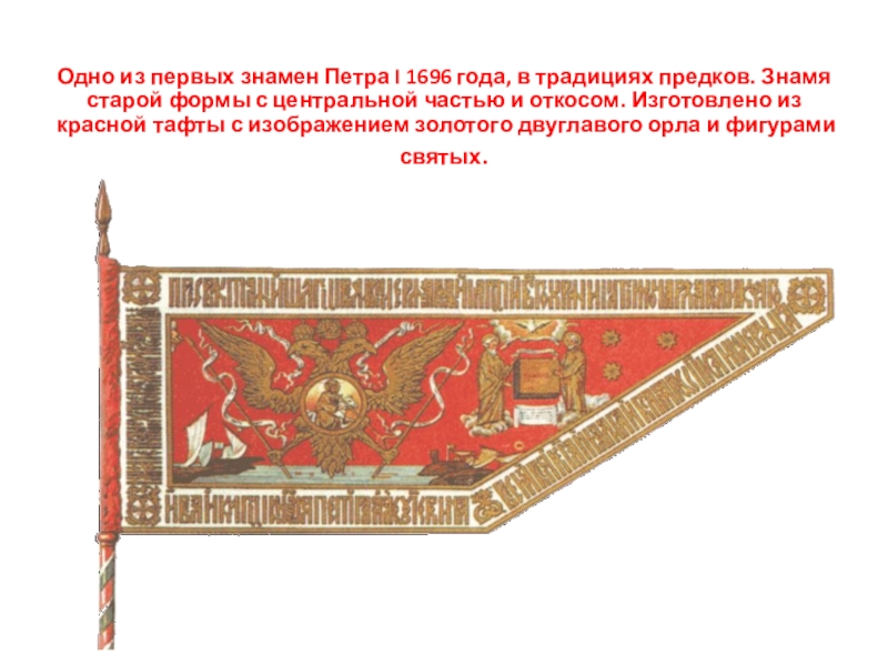 Слайд 17Одно из первых знамен Петра I 1696 года, в традициях предков.