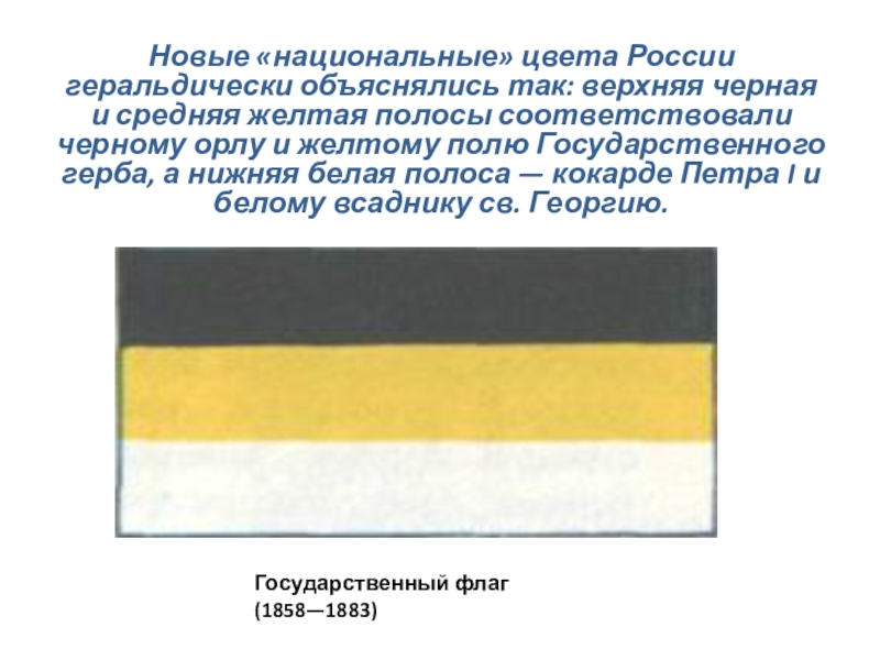 Слайд 23Новые «национальные» цвета России геральдически объяснялись так: верхняя черная и средняя
