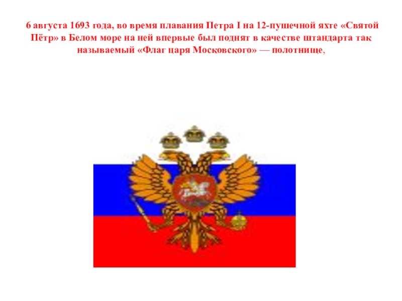 яхте «Святой Пётр» в Белом море на ней впервые был поднят в качестве штандарта так называемый «Флаг царя Московского» — полотнище,