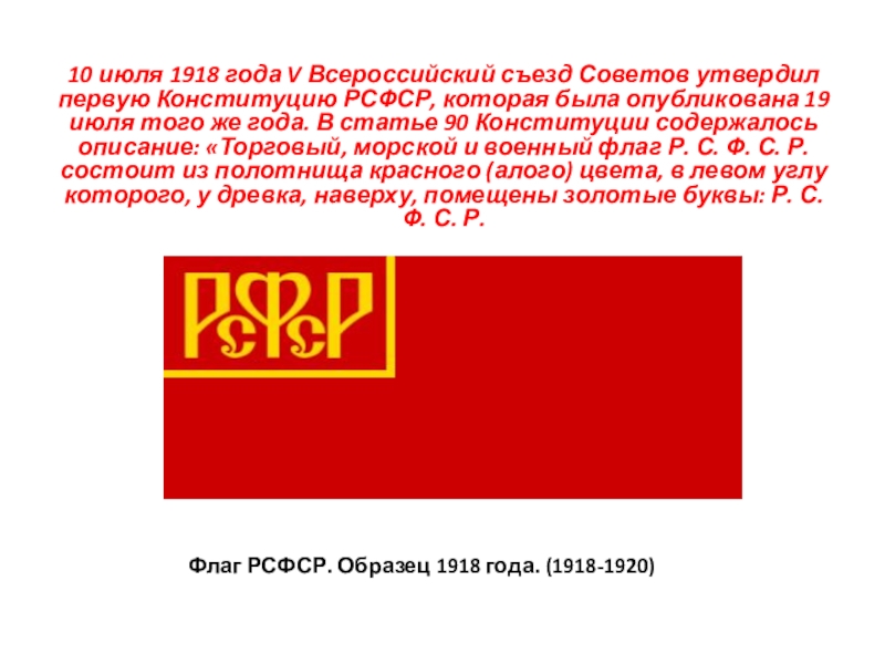 РСФСР, которая была опубликована 19 июля того же года. В статье 90 Конституции содержалось описание: «Торговый, морской и военный флаг Р. С. Ф. С. Р. состоит из полотнища красного (алого) цвета, в левом углу которого, у древка, наверху, помещены золотые буквы: Р. С. Ф. С. Р.