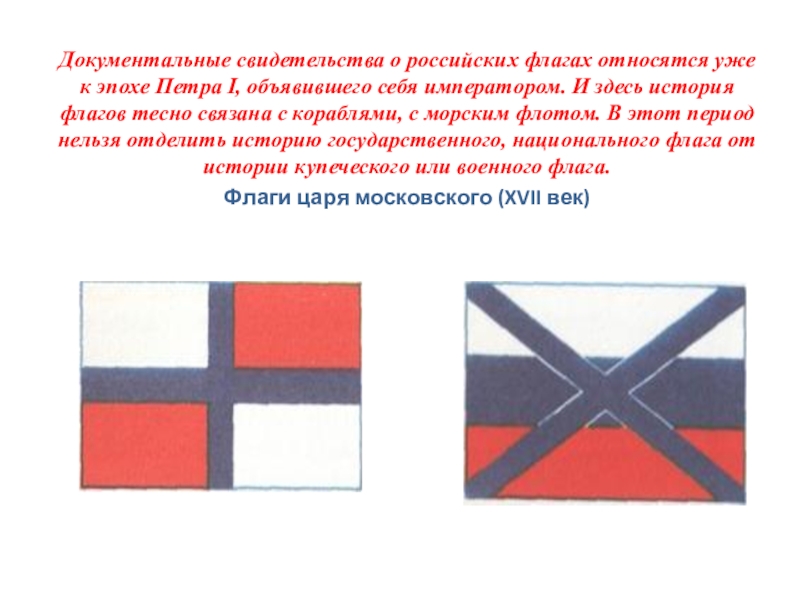 Слайд 20Документальные свидетельства о российских флагах относятся уже к эпохе Петра I,