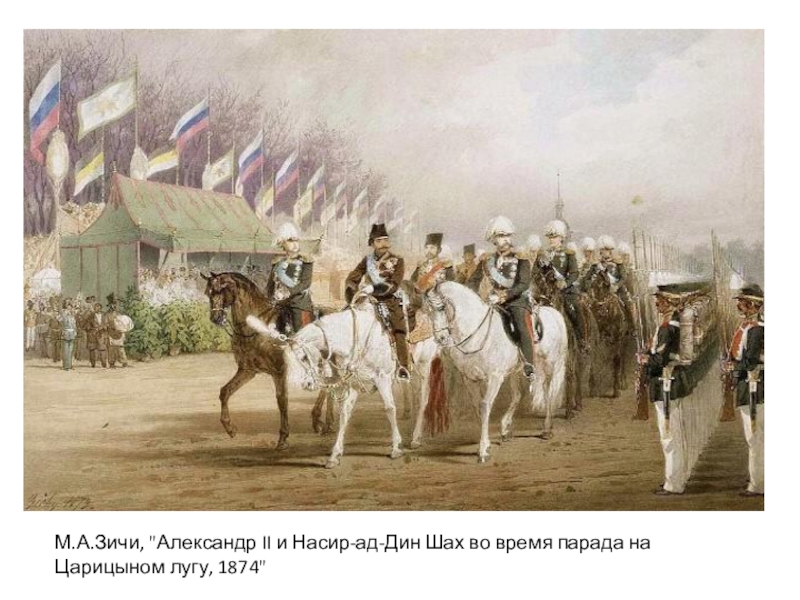 Слайд 22М.А.Зичи, "Александр II и Насир-ад-Дин Шах во время парада на Царицыном