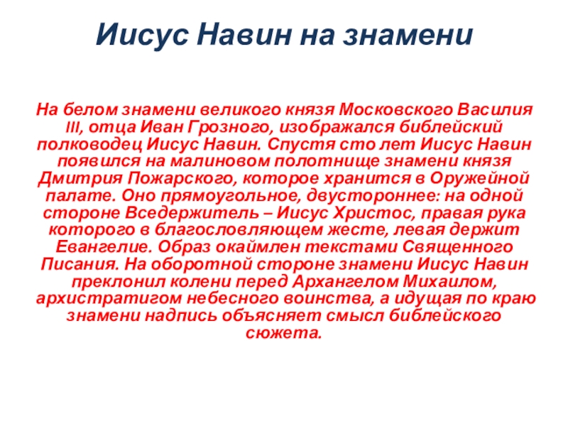 отца Иван Грозного, изображался библейский полководец Иисус Навин. Спустя сто лет Иисус Навин появился на малиновом полотнище знамени князя Дмитрия Пожарского, которое хранится в Оружейной палате. Оно прямоугольное, двустороннее: на одной стороне Вседержитель – Иисус Христос, правая рука которого в благословляющем жесте, левая держит Евангелие. Образ окаймлен текстами Священного Писания. На оборотной стороне знамени Иисус Навин преклонил колени перед Архангелом Михаилом, архистратигом небесного воинства, а идущая по краю знамени надпись объясняет смысл библейского сюжета.