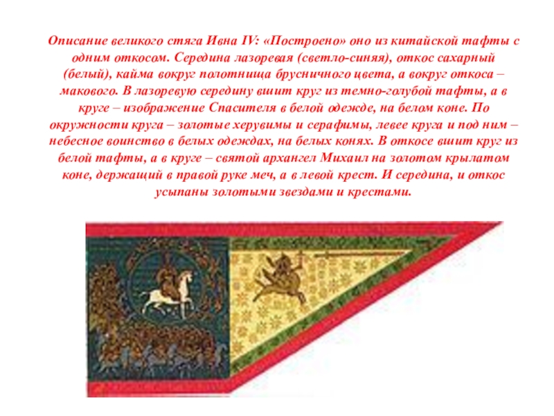 Слайд 9Описание великого стяга Ивна IV: «Построено» оно из китайской тафты с