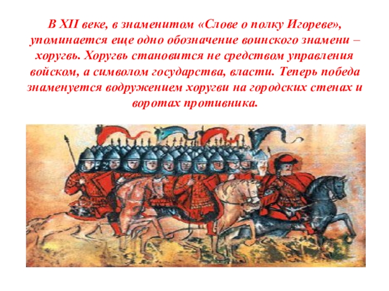одно обозначение воинского знамени – хоругвь. Хоругвь становится не средством управления войском, а символом государства, власти. Теперь победа знаменуется водружением хоругви на городских стенах и воротах противника.