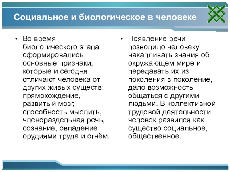 Появление речи позволило человеку накапливать знания об окружающем мире и передавать их из поколения в поколение, дало возможность общаться с другими людьми. В коллективной трудовой деятельности человек развился как существо социальное, общественное.