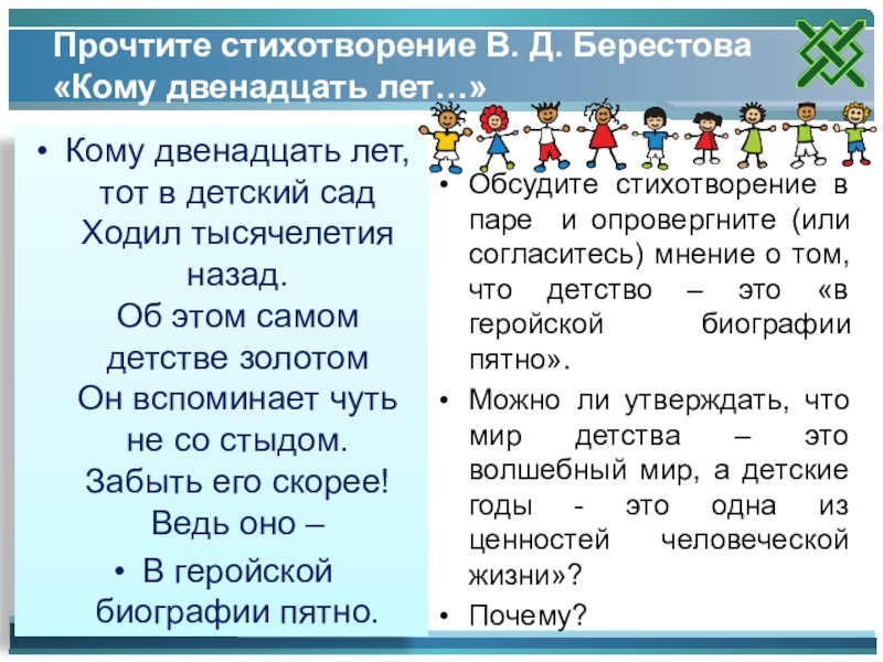 Обсудите стихотворение в паре и опровергните (или согласитесь) мнение о том, что детство – это «в геройской биографии пятно».