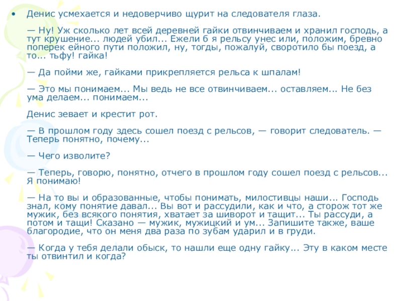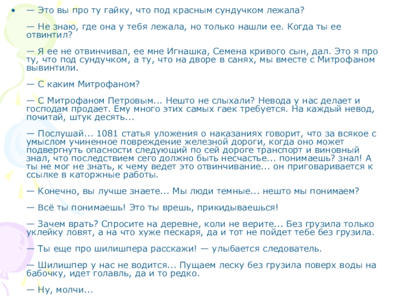 — Денис Григорьев! — начинает следователь. — Подойди поближе и отвечай на мои вопросы. Седьмого числа сего июля железнодорожный сторож Иван Семенов Акинфов, проходя утром по линии, на 141-й версте, застал тебя за отвинчиванием гайки, коей рельсы прикрепляются к шпалам. Вот она, эта гайка!.. С каковою гайкой он и задержал тебя. Так ли это было?